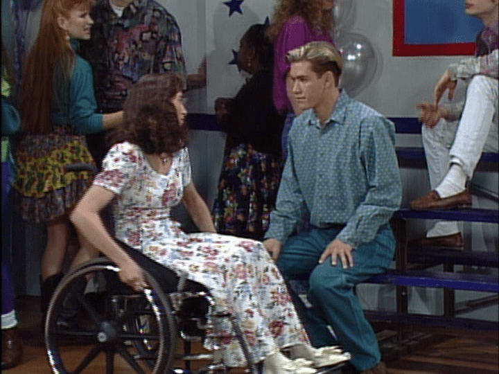 The reason why I’m writing about saved by the bell Because I recently came across an episode entitled Teen Line the Premises of that episode that the main protagonist Zack Morris starts a teen hotline that’s where he ”Meets ” Melissa, who is a wheelchair user but doesn’t know that about her at first.